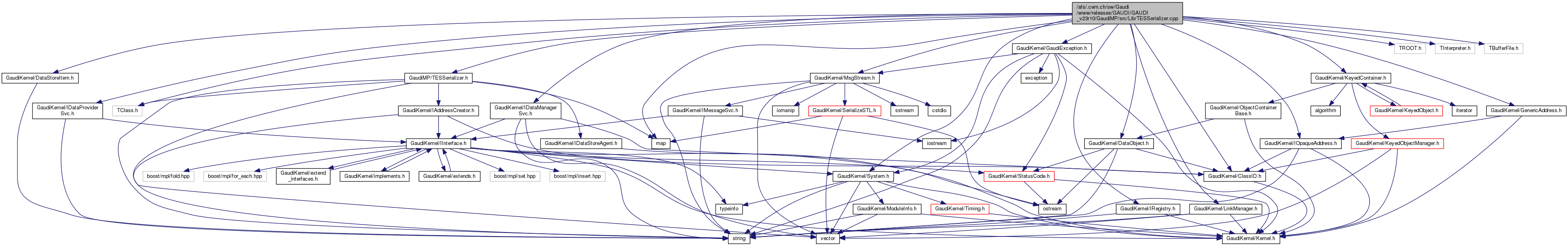 #include "GaudiMP/TESSerializer.h"#include "GaudiKernel/IRegistry.h"#include "GaudiKernel/IDataManagerSvc.h"#include "GaudiKernel/IDataProviderSvc.h"#include "GaudiKernel/LinkManager.h"#include "GaudiKernel/DataObject.h"#include "GaudiKernel/DataStoreItem.h"#include "GaudiKernel/System.h"#include "GaudiKernel/GaudiException.h"#include "GaudiKernel/IOpaqueAddress.h"#include "GaudiKernel/GenericAddress.h"#include "GaudiKernel/ClassID.h"#include "GaudiKernel/KeyedContainer.h"#include "GaudiKernel/MsgStream.h"#include "TROOT.h"#include "TClass.h"#include "TInterpreter.h"#include "TBufferFile.h"#include <map>