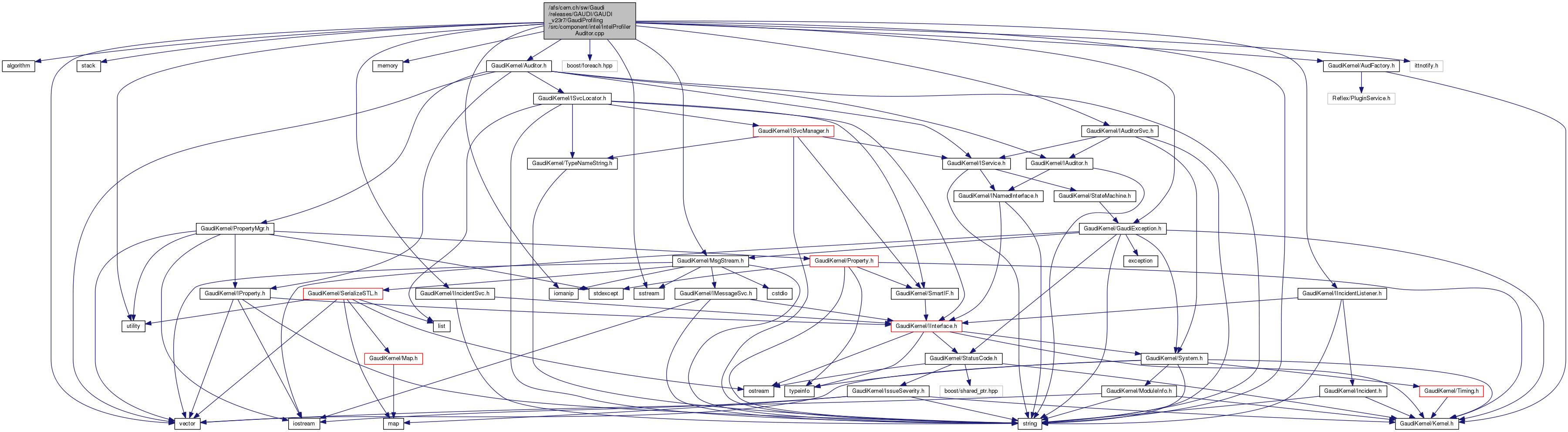 #include <algorithm>#include <vector>#include <stack>#include <string>#include <utility>#include <memory>#include <iomanip>#include <sstream>#include <boost/foreach.hpp>#include "GaudiKernel/AudFactory.h"#include "GaudiKernel/Auditor.h"#include "GaudiKernel/IAuditorSvc.h"#include "GaudiKernel/GaudiException.h"#include "GaudiKernel/MsgStream.h"#include "GaudiKernel/IIncidentListener.h"#include "GaudiKernel/IIncidentSvc.h"#include "ittnotify.h"