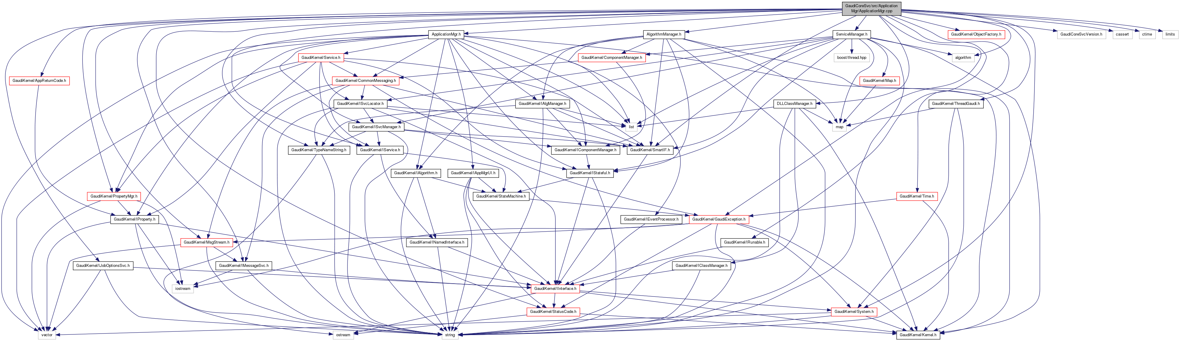 #include "ApplicationMgr.h"#include "ServiceManager.h"#include "AlgorithmManager.h"#include "DLLClassManager.h"#include "GaudiKernel/TypeNameString.h"#include "GaudiKernel/IService.h"#include "GaudiKernel/IRunable.h"#include "GaudiKernel/IMessageSvc.h"#include "GaudiKernel/IJobOptionsSvc.h"#include "GaudiKernel/SmartIF.h"#include "GaudiKernel/MsgStream.h"#include "GaudiKernel/PropertyMgr.h"#include "GaudiKernel/ObjectFactory.h"#include "GaudiKernel/GaudiException.h"#include "GaudiKernel/ThreadGaudi.h"#include "GaudiKernel/StatusCode.h"#include "GaudiKernel/Time.h"#include "GaudiKernel/System.h"#include "GaudiKernel/AppReturnCode.h"#include "GaudiCoreSvcVersion.h"#include <algorithm>#include <cassert>#include <ctime>#include <limits>