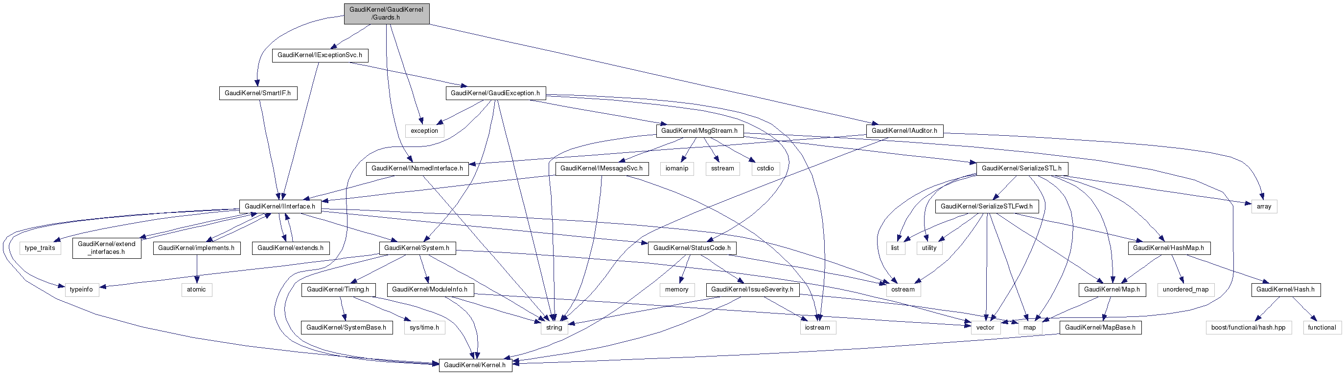 Guards.h GaudiKernel/Guards.h Collection of very simple classes which allows to execution of some functions within the given well-defined and exception-safe context. | |