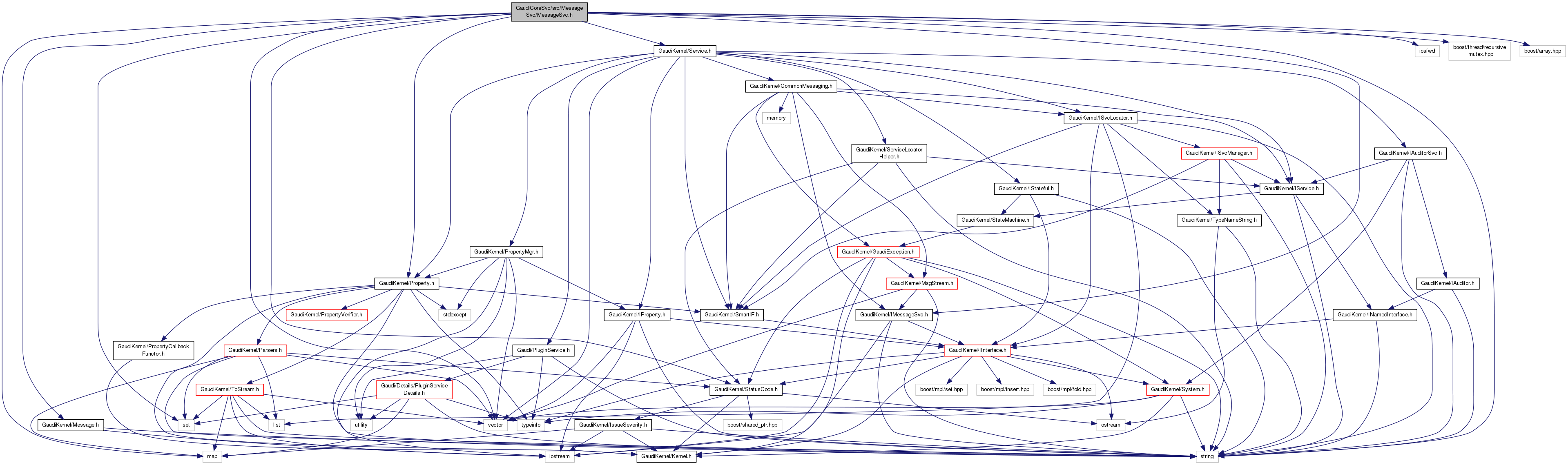 #include <string>#include <vector>#include <map>#include <set>#include <iosfwd>#include "GaudiKernel/StatusCode.h"#include "GaudiKernel/Service.h"#include "GaudiKernel/IMessageSvc.h"#include "GaudiKernel/Message.h"#include "GaudiKernel/Property.h"#include <boost/thread/recursive_mutex.hpp>#include <boost/array.hpp>